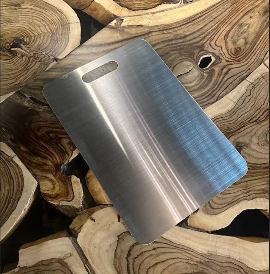 These are light surface scratches that naturally occur when cutting or chopping on stainless steel and are purely cosmetic. They do not affect the integrity, safety, or performance of your board in any way. Stainless steel is highly durable and non-porous, meaning it won’t harbor bacteria, absorb odors, or leech metal particles into your food—even with visible surface wear.