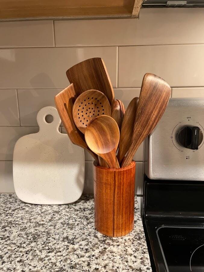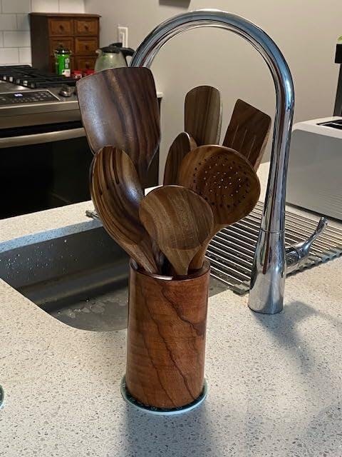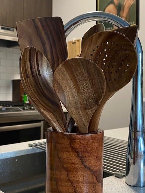 "These wooden utensils are quickly becoming my favorite. I was looking for an alternative to plastic/silicone utensils and found these. They are very well made, thicker than typical wooden utensils found in box stores and look great sitting on my counter. I purchased food grade mineral oil to treat them and keep them from cracking. They would make a great gift, especially for a housewarming. I highly recommend them."